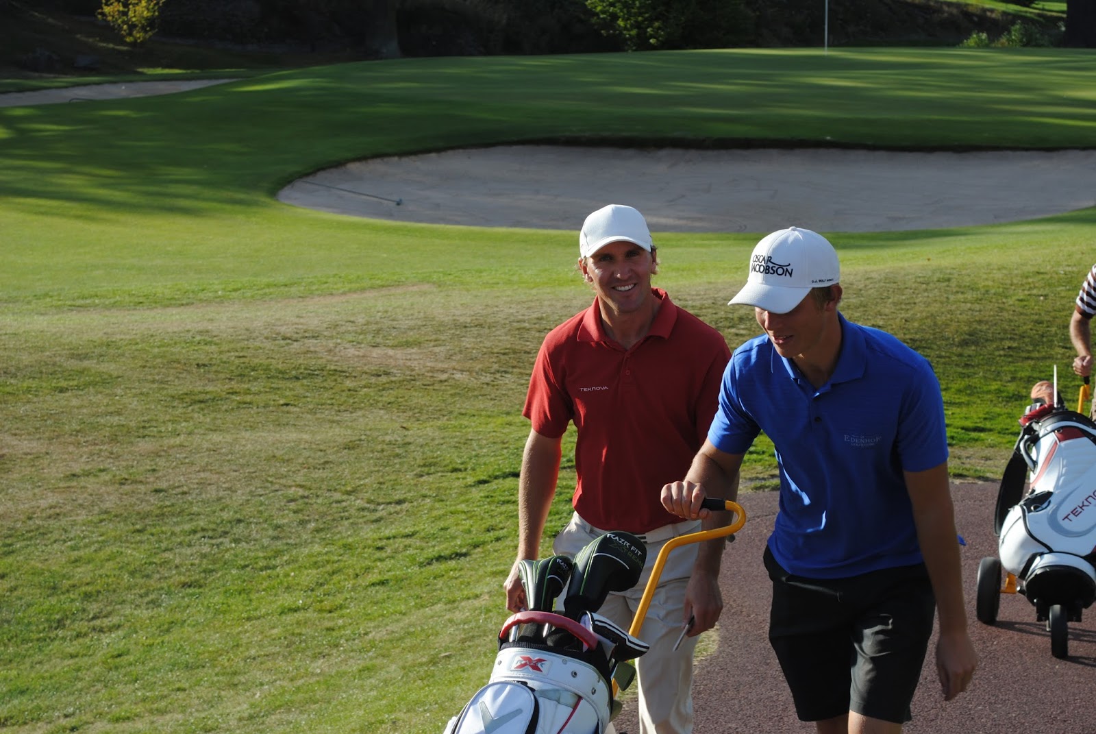 Saken är klar och sista putten i hål. Gustav i rött tillsammans med en motspelare |